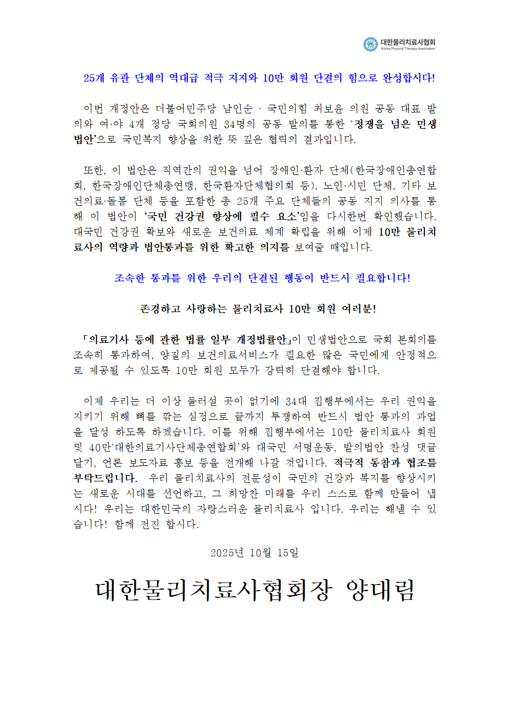 #대한물리치료사협회 #의료기사법개정 #물리치료사의미래 #전문성강화 #국민건강증진