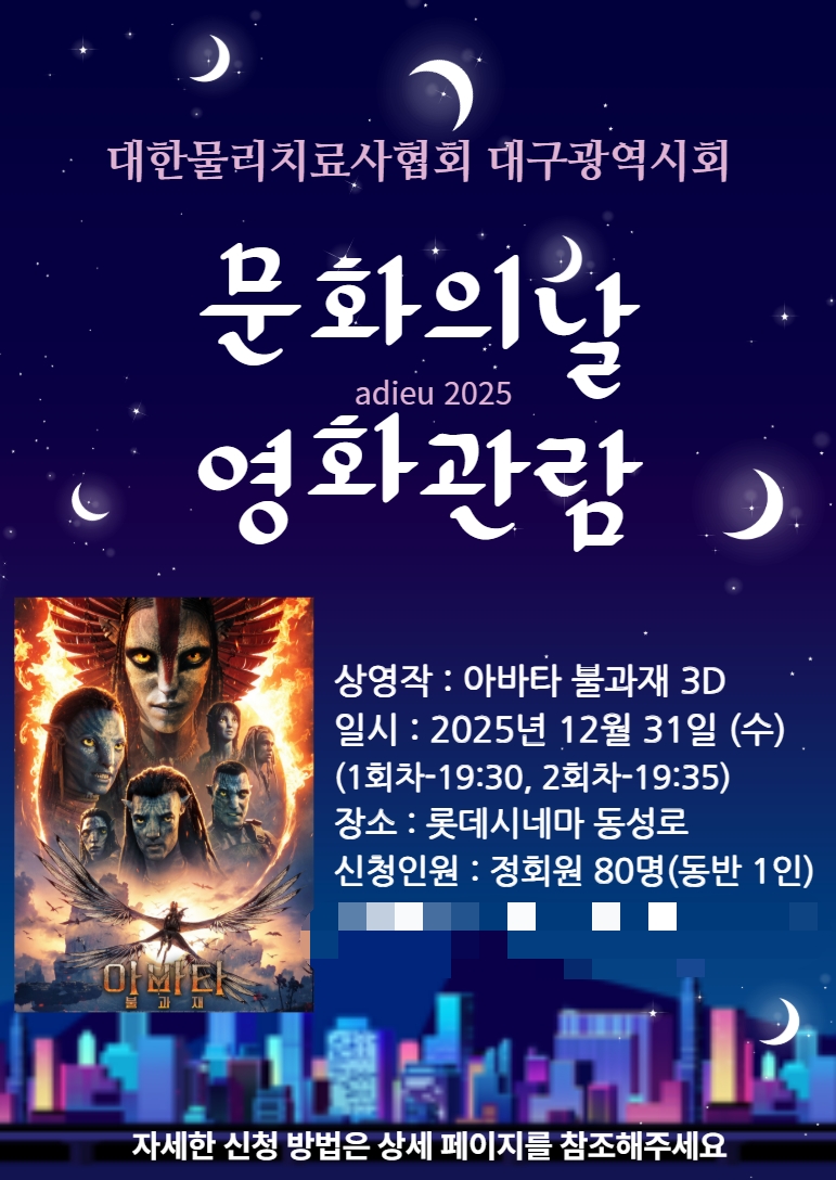 대구광역시회 회원들의 문화생활 지원 및 복지 증진을 위해 아래와 같이 2025년 문화의 날 영화 관람 행사를 개최하오니 ⎾아바타 불과재⏌ 관람 계획이 있는 회원분들은 참고하시기 바라며 많은 관심과 참여 부탁드립니다.