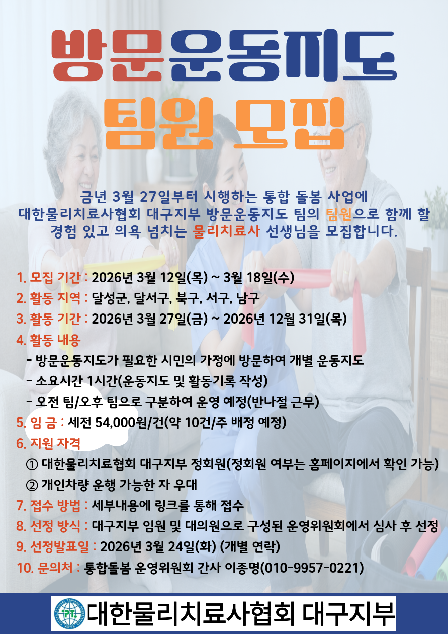 금년 3월 27일부터 시행하는 통합 돌봄 사업에 대한물리치료사협회 대구지부 방문운동지도 팀의 팀원으로 함께 할 경험 있고 의욕 넘치는 물리치료사 선생님을 모집합니다.