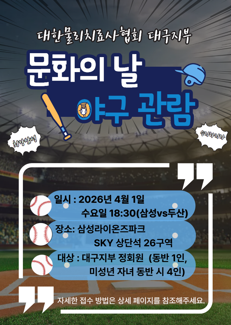사랑하는 가족, 친구, 연인과 함께 야구경기 관람하는건 어떠세요? 대한물리치료사협회 대구지부가 회원분들을 위해 준비했습니다.